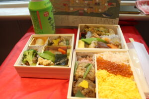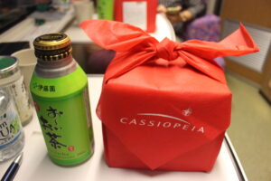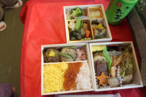 お弁当は鮮やかな朱色のナプキンに包まれた